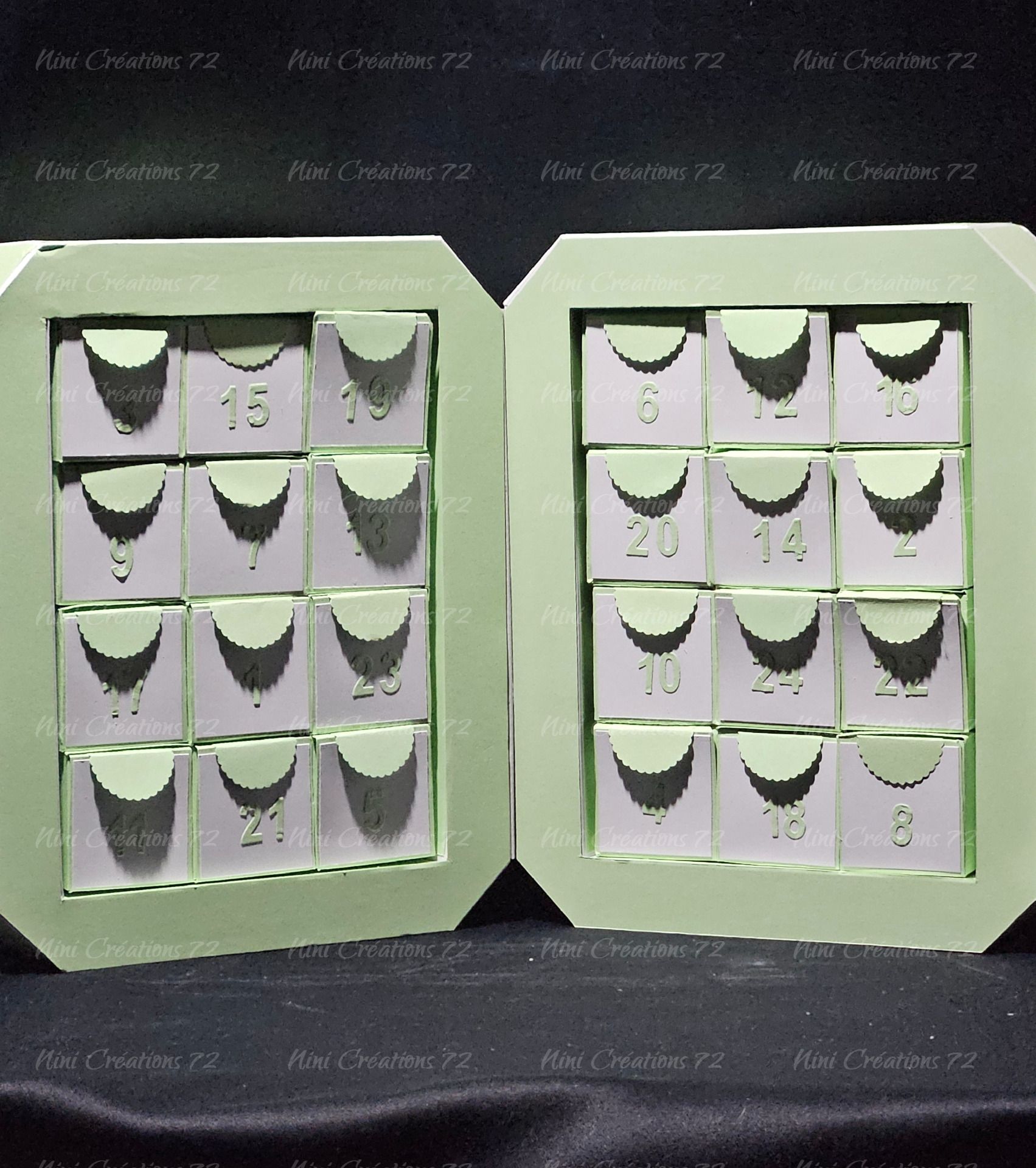 Calendrier de l'avent contenant 24 cases remplis de chocolats + 1 cadeau.