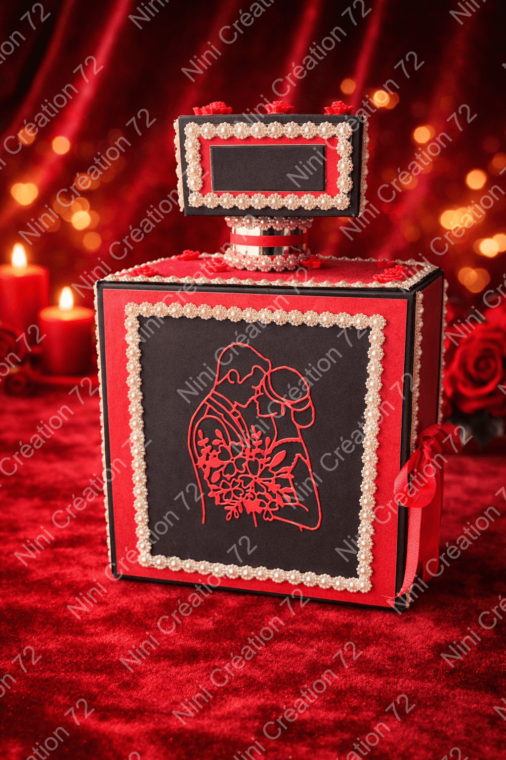 Ce coffret artisanal rouge et noir, délicatement orné de perles et d’une découpe romantique représentant un couple enlacé, incarne l’amour et l’élégance. Chaque détail a été pensé avec soin.